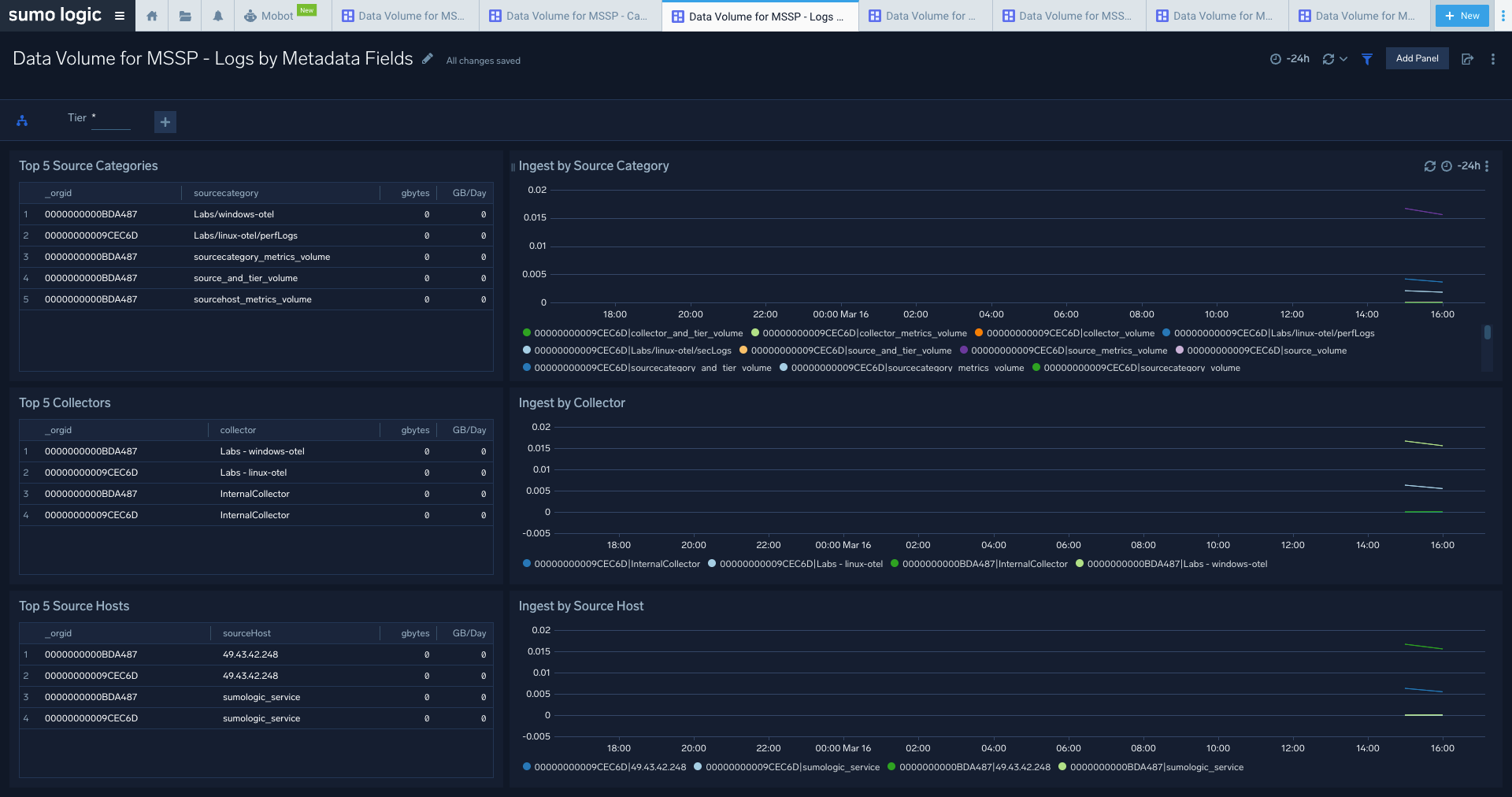 The Data Volume for MSSP - Logs by Metadata Fields dashboard allows you to view log ingest volume by tier, source categories, collectors, and hosts for child orgs