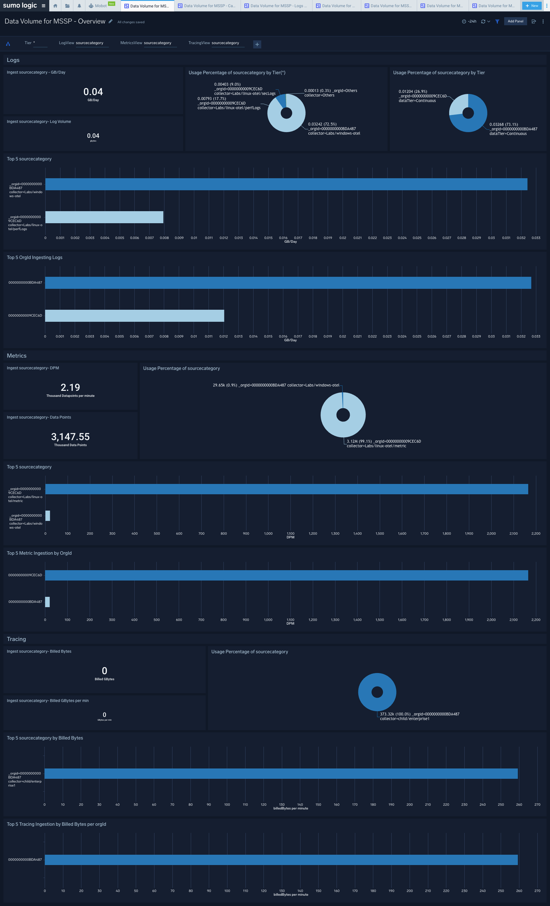 The Data Volume for MSSP - Overview dashboard helps you understand child org ingest in terms of logs (by tiers), metrics, and tracing capabilities.