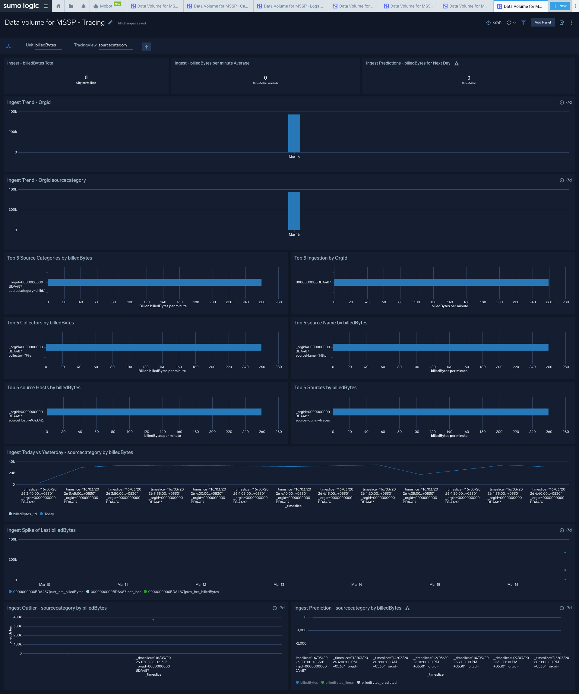 Use this dashboard to identify the top sources, collectors, or hosts by ingesting data volume across logs, metrics, and traces by child orgs.