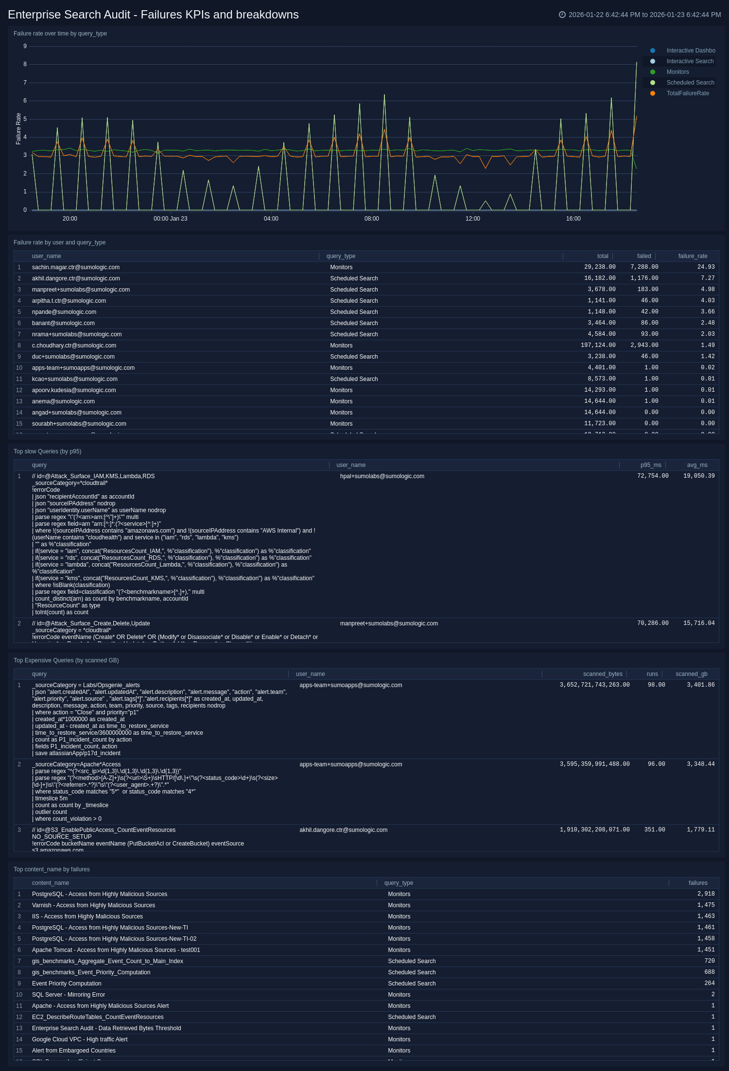 - Track failure rate over time, segmented by query type (Interactive Search, Interactive Dashboard, Monitors, Scheduled Searches).