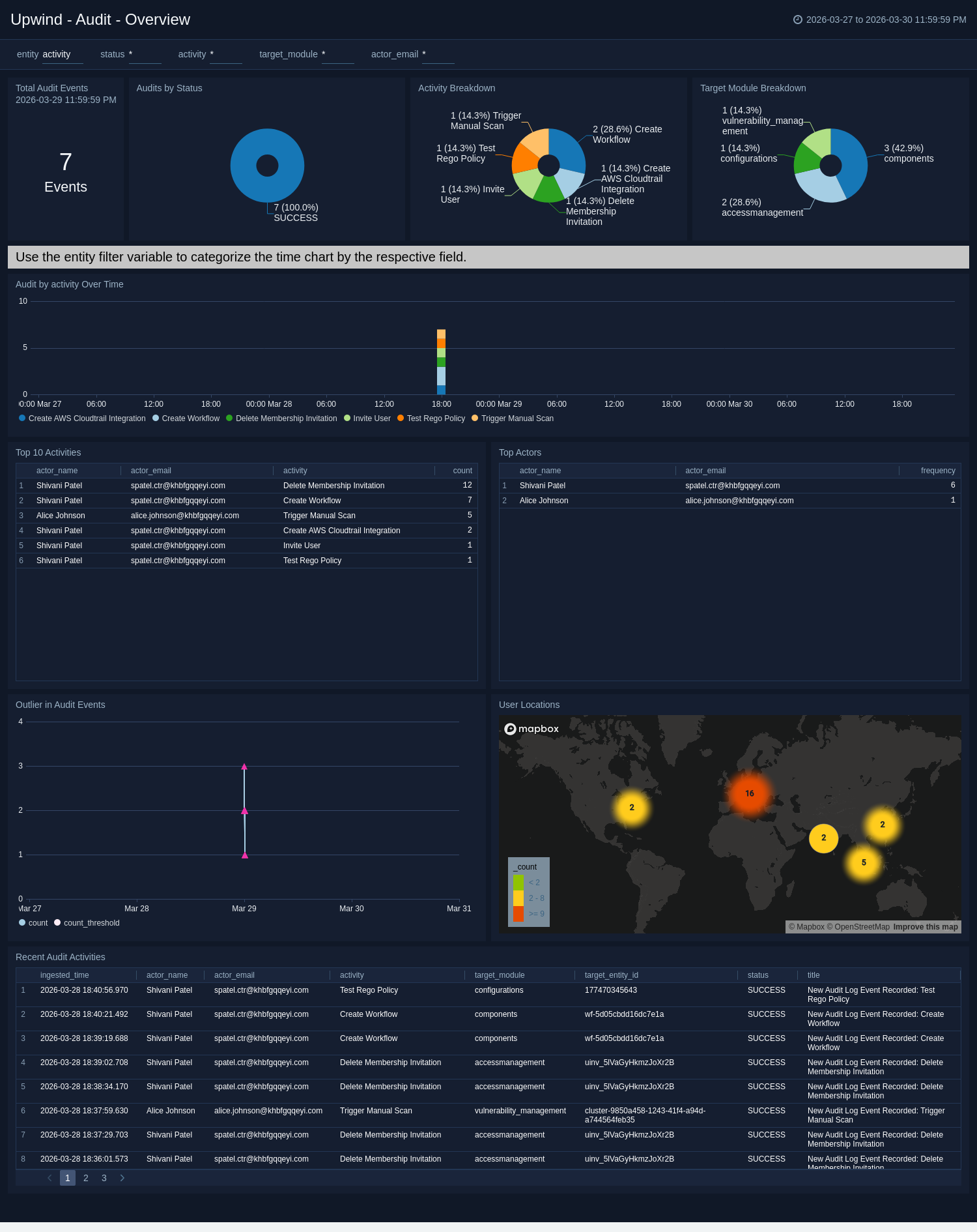 The Upwind - Audit - Overview dashboard provides high-level visibility into audit event volume and status, activity trends over time, and recent audit records for investigation.