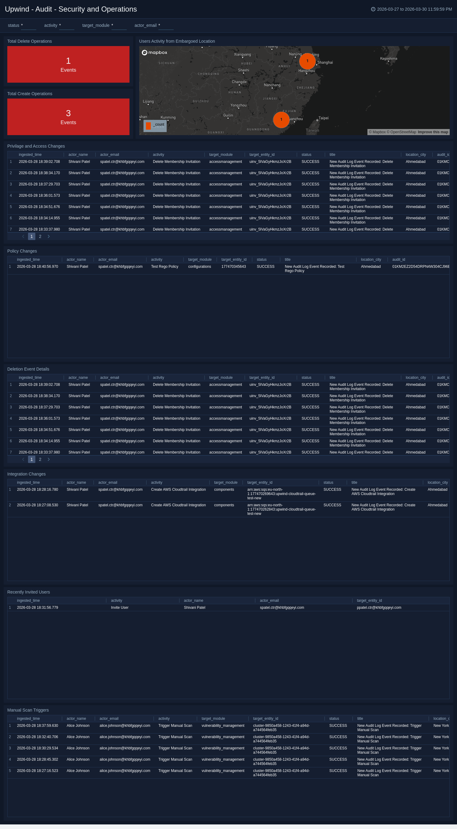 Upwind - Audit Activity from Embargoed Location | This alert is triggered when Upwind audit activity originates from embargoed or high-risk geographies. This may indicate unauthorized access, policy violations, or suspicious administrative behavior from restricted locations. | Count > 0 | Count < = 0 |