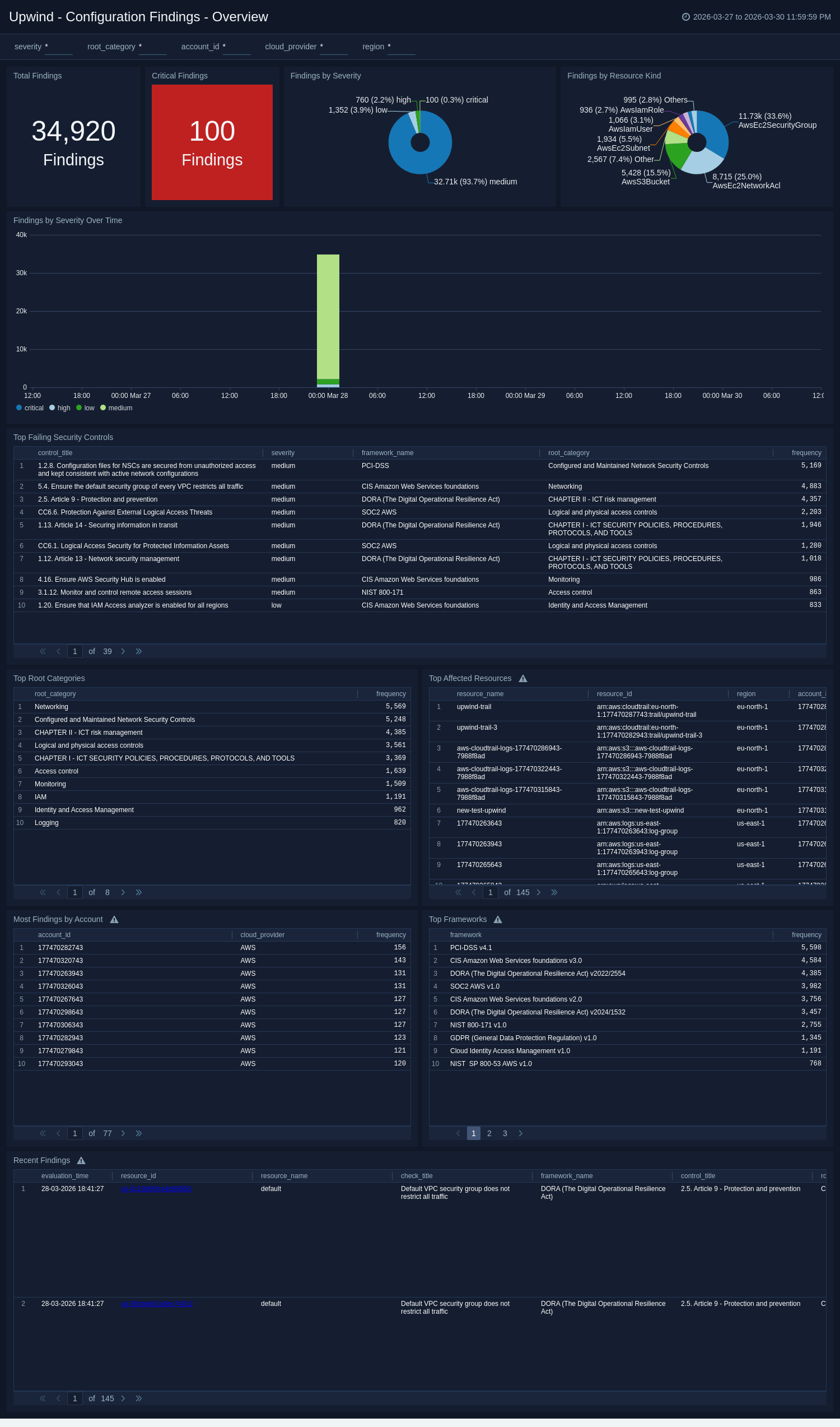 The Upwind - Configuration Findings - Overview dashboard provides insights into configuration findings, including severity and trend-oriented analysis.