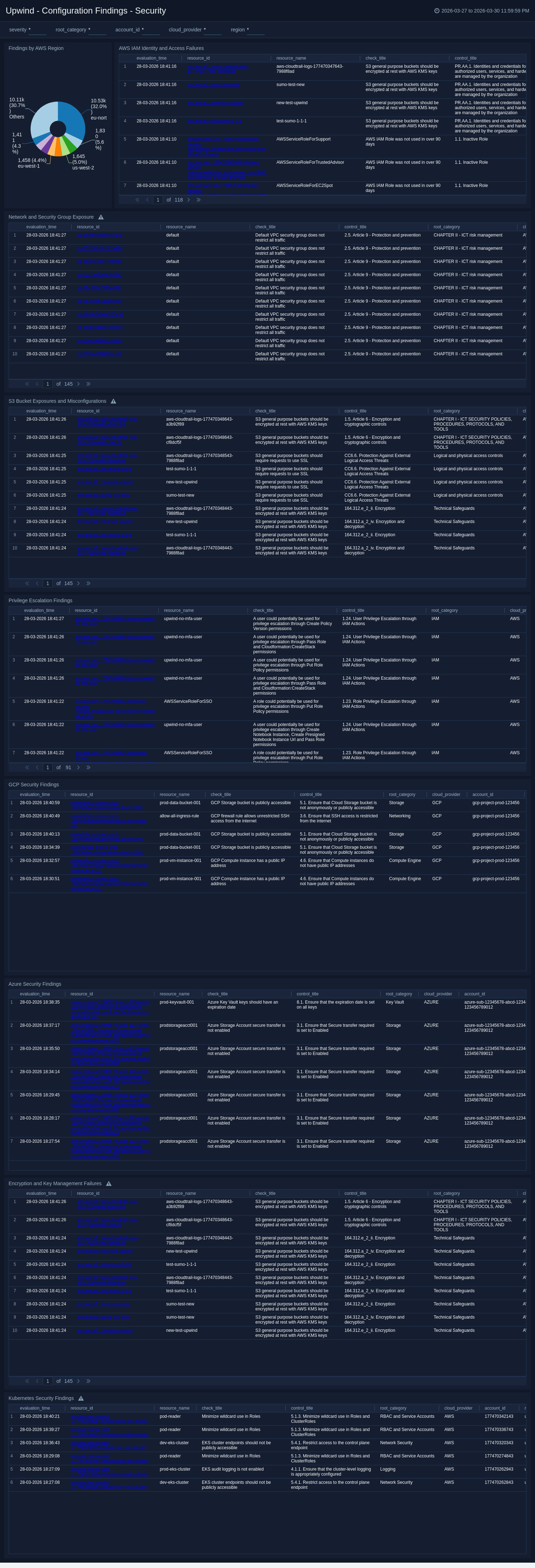 The Upwind - Configuration Findings - Security dashboard helps security teams investigate security-relevant findings and prioritize remediation.