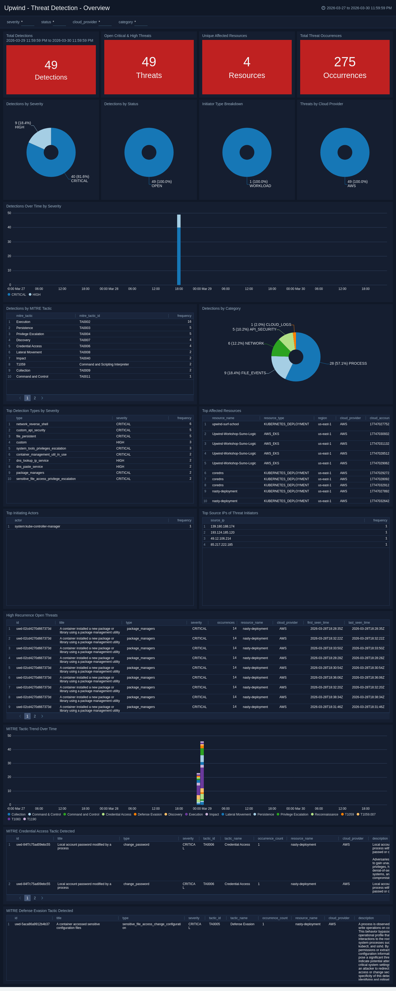 The Upwind - Threat Detection - Overview dashboard provides comprehensive visibility into threat detections, including severity distribution, MITRE ATT&CK tactics, affected cloud resources, initiating actors, and high-recurrence open threats.