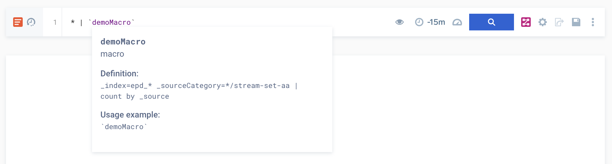- Usage. Preview of how you use the macro in the log search.