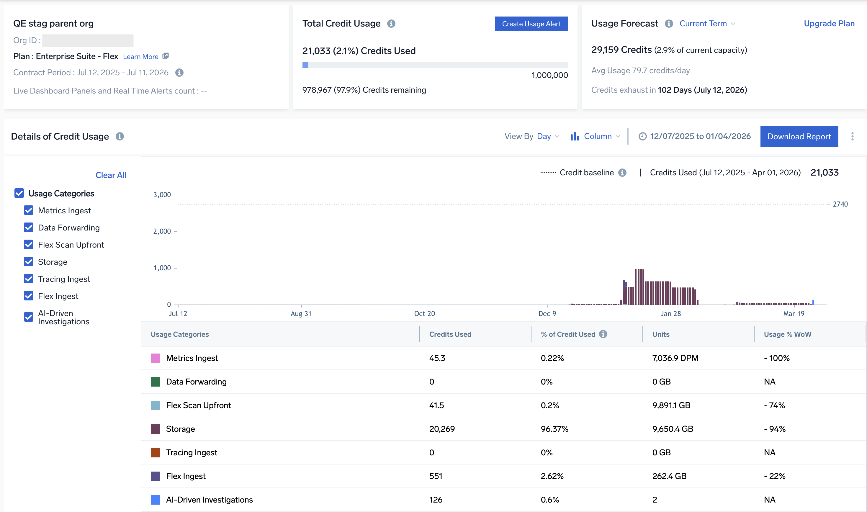 - Total Credits Usage breakdown. Includes consumed contract and promotional credits.