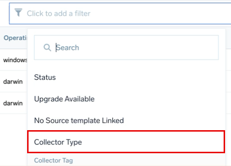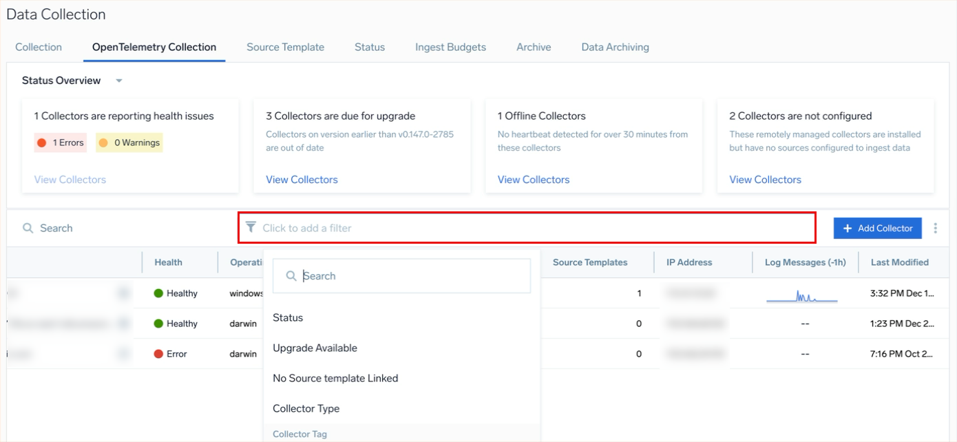 - On the OpenTelemetry Collection page, click the Click to add a filter bar and then select Collector Type from the dropdown.