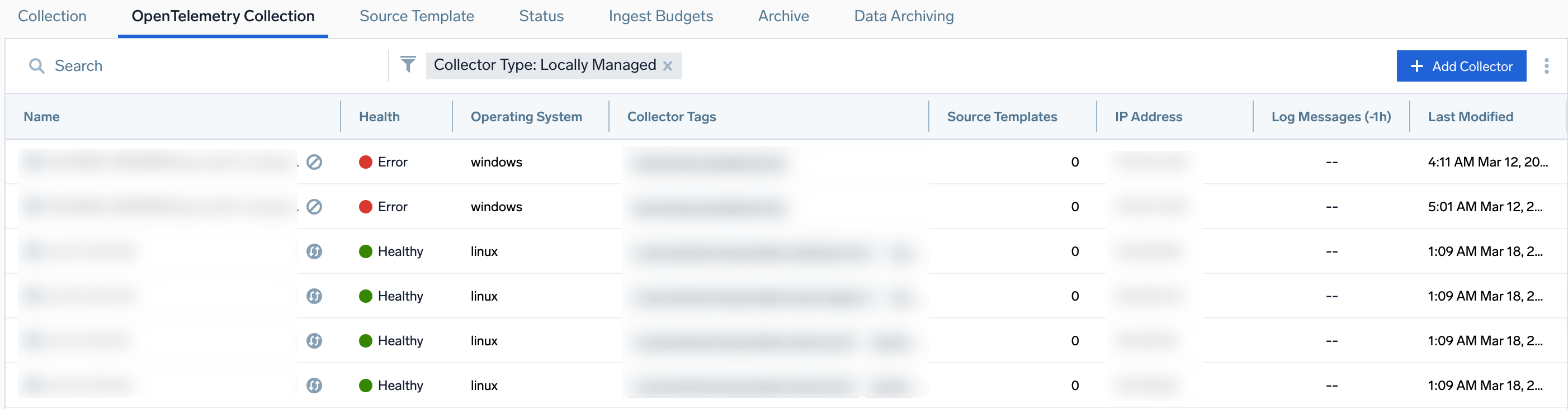 - Based on the selected collector type, you can view a list of either locally managed collectors or remotely managed collectors.