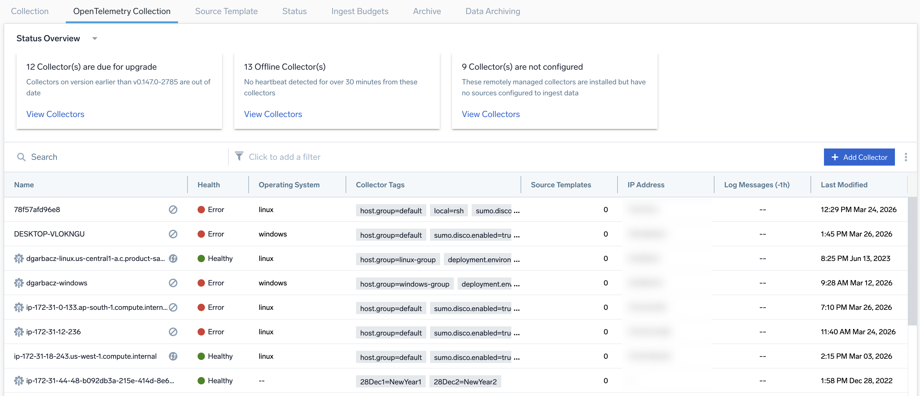 Classic UI. In the main Sumo Logic menu, select Manage Data > Collection > OpenTelemetry Collector.