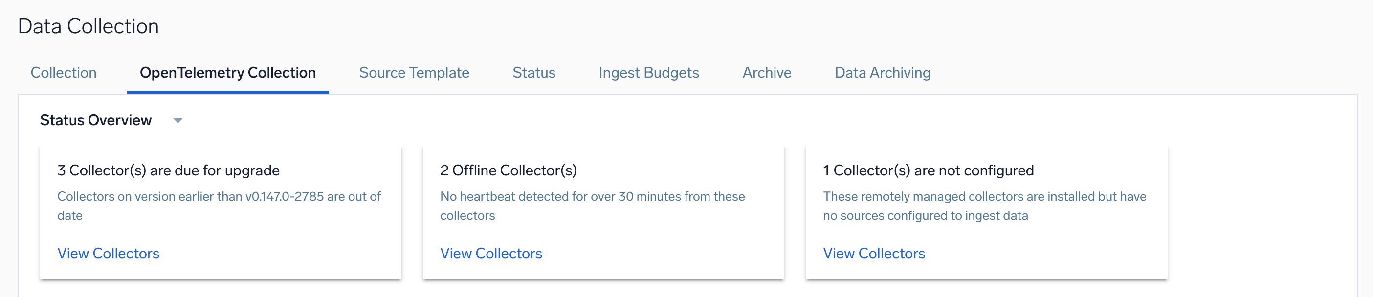 The Status Overview panels provide a centralized, high-level health view of OpenTelemetry collectors. Each panel displays the count of collectors affected by its specific condition and includes a View Collectors button to filter and display the corresponding collectors.