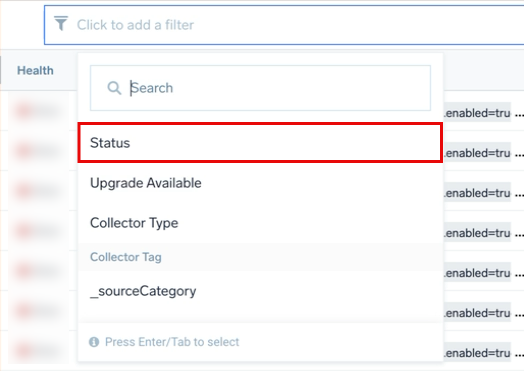 - On the OpenTelemetry Collection page, click the Click to add a filter bar and then select Status from the dropdown.