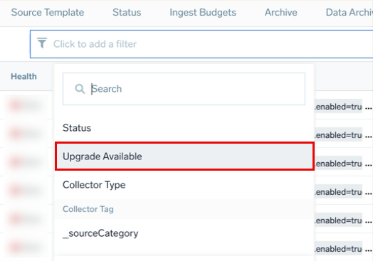 - On the OpenTelemetry Collection page, click the Click to add a filter bar and then select Upgrade Available.